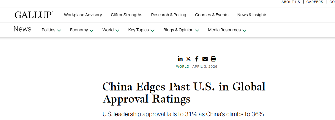 美国著名民意调查公司盖洛普3日发布的一项调查结果显示,来自130多个国家和地区的受访者中有36%认可中国的全球领导力,31%的人认可美国的领导力。这是盖洛普记录的近20年来中美之间的最大差距,达5个百分点。该调查由盖洛普于2025年在130多个国家进行,比较了中国、美国、德国和俄罗斯的全球领导力。报告强调,它审视了早在2026年初发生的几件重大事件,包括美国退出66个国际组织以及2月下旬对伊朗采取的军事行动。记者发现,近一年来r,美国 44 个国家的支持率暴跌 10 个百分点或更多,而只有 7 个国家的支持率出现类似上升。这种下降在北约盟国中尤为明显:德国、葡萄牙、加拿大、英国和意大利均出现显着下降。以色列是个例外,其支持率反弹至 76%。 23个国家对中国领导力的满意度上升了10%以上。报告显示,中国在全球平均知识、网络知识和相对网络知识三项指标上领先美国。报告认为,中国对美国的认可程度提高反映了美国威望的更广泛下降。报告的结论是,过去二十年人们对美国领导地位的看法发生了变化,反映出世界正在向更加“多极”的秩序转变。许多国家,特别是美国的盟友,可能更愿意平衡大国关系,而不是采取明确立场。对于公司和投资者,这意味着更大的环境不确定性。来源 |央视环球资讯编译|杨琼签名审核|监制:张翰 |蔡耀源