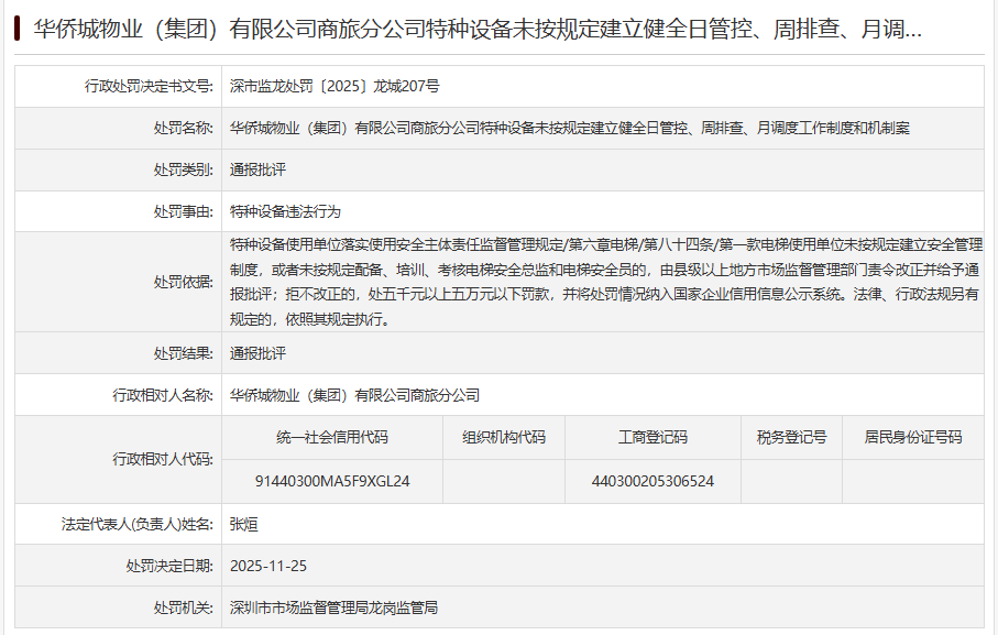 华侨城房地产分公司因违反特种设备相关法律法规,被深圳市监管部门通报批评。