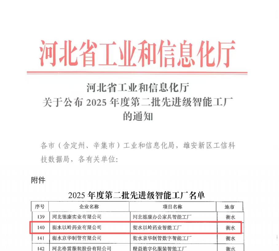 衡水以岭药业荣获河北省“先进智能工厂”称号