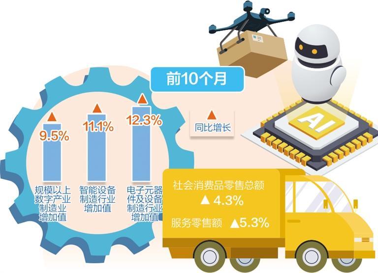 国家统计局公布的数据显示,10月份生产需求平稳增长,就业价格总体稳定,转型改善持续推进。今年以来,面对国际环境复杂变化、外部负面影响加深、国内市场供需旺盛、物价下跌等情况,各地区、各行业加大力度实施更加积极的宏观经济政策,深化全国统一市场建设,深化改革、扩大开放,强化创新驱动发展。国民经济顶住压力,保持平稳、稳中有进的发展态势。 10月份经济运行总体平稳,生产和供给量继续增加。农业生产条件良好,预计全年谷物丰收。工业生产总体平稳。 10月份,规模以上工业增加值比去年同月增长4.9%,保持稳定增长。服务业增长平稳。 10月份服务业生产指数比去年同月增长4.6%。增速较上月略有下降,主要是去年同期基数增加所致。从两年累计和平均增速看,服务业增长基本平稳。国庆节和中秋节假期加快了相关服务业的增长。 10月份住宿和餐饮业生产指数较去年同月增长3.9%,加快2.6个百分点与上个月相比。市场销量不断扩大。刺激消费专项措施持续有效,假日经济对经济提振作用发挥重要作用,商品和服务零售额持续增长。 10月份社会消费品零售总额比去年同月增长2.9%,消费品交换相关产品销售也保持高速增长。节日期间居民出行增多,旅游、文化等服务消费增加。前10个月,服务业零售额同比增长5.3%。就业形势总体稳定。全国城镇调查显示,10月份失业率为5.1%,连续第二个月下降。其中,城镇登记外出务工农业劳动力调查失业率为4.5%,比上月下降0.2个百分点,环比下降0.2个百分点。明显低于城镇一般调查失业率。后备军。就业形势总体稳定,重点群体就业持续改善,为保障民生、促进发展发挥了重要作用。价格出现积极变化。 10月份,居民消费价格由降转升,剔除食品和能源的核心CPI(居民消费价格指数)同比上涨1.2%,比上月扩大0.2个点,涨幅连续第6个月扩大。工业生产者出厂价格降幅连续三个月收窄,市场竞争秩序规范效果显现。 10月份,锂离子电池制造、太阳能发电设备及零部件制造等行业价格环比分别上涨0.2%和0.6%。还要看到,外部环境不稳定不确定因素较多,内部结构调整压力较大,经济平稳运行面临诸多挑战。要围绕经济稳定、企业稳定、市场稳定、预期稳定,积极推动宏观经济政策持续落实和发挥效益,全面深化改革开放,进一步强化创新引领,推动经济实现质的有效提升和量的合理增长。培育壮大新动能 今年以来,我国推动经济结构调整、加快培育新动能继续取得积极成效。数字经济、平台经济等新需求不断扩大,新兴产业快速发展,发展势头强劲。工业成熟度显着,有力支撑了经济稳定运行。市场需求更新完善,新需求不断增长。从消费看,消费新业态、新模式、新场景不断拓展,数字化、绿色化、智能化产品消费快速增长,服务消费也在不断扩大。前10个月,实物商品网上零售额占社会消费品零售总额的比重为25.2%。文化体育休闲服务、旅游咨询租赁服务零售额保持两位数增长。从投资角度看,我们将聚焦优势领域和短板,扩大有效投资。高新技术领域投资快速增长。新能源、新材料、人工智能等领域投资持续扩大。因此,投资的质量和效率情况持续改善。从出口看,机电产品、高新技术产品出口不断增加,对外贸发挥了重要支撑作用。工业高端化趋势明显,先进制造业、现代服务业比重不断提高。制造业稳步迈向中高档制造业,装备制造业对支撑矿业和工业生产发挥着重要作用。前10个月,规模以上装备制造业增加值比上年增长9.5%,占规模以上工业比重为36.1%,对规模以上工业增加值增长的贡献达到58.7%。服务业与先进制造业深度融合,现代服务业发展势头强劲。 1-3月,信息传输软件、技术服务、信息租赁和商务服务增加值合计占第三产业的16.3%,比去年同期提高0.8个百分点。新兴产业不断发展壮大,引领和支撑功能日益增强。数字经济快速发展,绿色低碳转型持续深化,人工智能推动产业发展,数字制造、智能制造等产业不断壮大。前10个月,规模以上数字产业制造业增加值同比增长9.5%,智能装备制造业、电子元件制造业、装备制造业增加值分别增长11.1%和12.3%。新能源、新材料航天工业、低空经济等,发展潜力巨大。量子技术、生物制造和实体智能有着广泛的前景。这些有望成为未来新兴支柱产业,有力支撑发展壮大新动能。付凌辉表示,中国经济结构调整仍在稳步推进,新旧动能转换将是阵痛的。但从未来发展看,新生产力培育增加,新能源不断增长,经济高质量发展趋势向好。实现年度计划有有利条件。 “从下一阶段形势看,经济管理面临诸多风险挑战,但支撑我国经济长期向好的基本条件和趋势没有改变。宏观经济政策经济持续强劲,市场空间逐步拓展,新生产力培育壮大,实现全年预期目标有一系列有利条件。付凌辉表示,从四大宏观经济指标来看,日本经济持续表现强劲,实现全年目标基础坚实。经济实现快速增长,一季度至三季度GDP同比增长5.2%,位居全球主要经济体行列。近期工业价格总体稳定。10月份全国城镇调查失业率持续下降,居民消费价格由同比下降转为积极变化。国际收支基本平衡。前10个月,我国货物进出口总额同比增长3.6%,年末外汇储备稳定在3.3万亿美元以上。十月。全年来看,旅游、文化体育、网络消费依然活跃,为消费增长注入新动力。我国不断扩大对外开放,不断拓展各类市场,对外贸易韧性不断