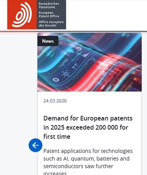 新华社柏林3月24日电 据欧洲专利局24日公布的《2025年技术小组报告》(原专利指数报告)显示,2025年欧洲专利局收到的来自中国的专利申请数量为22031件,比上年增长9.7%。中国专利申请量首次升至第三位,在专利申请前十名国家中增长最快。总体来看,2025年欧洲专利局共收到来自全球的专利申请201,974件,同比增长1.4%,创历史新高。专利申请数量最多的五个国家是美国、德国、中国、日本和韩国。报告显示,2025年来自中国的专利申请将占欧洲专利局收到的专利申请总量的10.9%。其中,数字通信是中国申请专利申请的领域。大多数专利。此外,交通运输和半导体是中国专利申请增长最快的领域,同比增速超过30%。 3月24日epo.org网站首页截图(部分)。如果从企业排名来分析,2025年向欧洲专利局提交专利申请的所有企业中,中国华为以4744件专利申请量位居第二。中国当代新能源科技有限公司以1305件专利申请量排名第10位。这是首次有两家中国企业进入前十名。韩国三星位居第一,其次是韩国LG和美国高通。除了华为和宁德时代之外,进入前50名的还有另外四家中国企业:小米、中兴、OPPO和腾讯。 d从技术领域来看,欧洲专利局收到最多专利申请的领域2025年是计算机技术领域,专利申请总量为17844件,比上年增长6.1%。报告认为,人工智能的快速发展是该领域专利增长的主要驱动力。数字通信领域的专利申请量增长最多,比上年增长11.4%,达17,802件。记者 杜哲宇 初一
